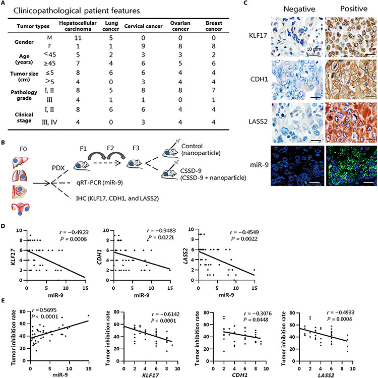 从61名患者中获得43种不同原发肿瘤并建立肿瘤异种移植(PDX)模型。结果揭示CSSD-9具有潜在的临床治疗价值,可将其视为使用CSSD治疗前临床易感性评估。采用IHC和FISH检测43例肿瘤中的KLF17、CDH1、LASS2和miR-9表达,发现其与肿瘤组织中的miR-9呈负相关;对患者肿瘤中CSSD-9肿瘤抑制率与miR-9、KLF17、CDH1和LASS2的表达之间的关系进行分析,发现肿瘤抑制率与miR-9表达正相关,但与KLF17、CDH1和LASS2表达呈负相关(图6)。